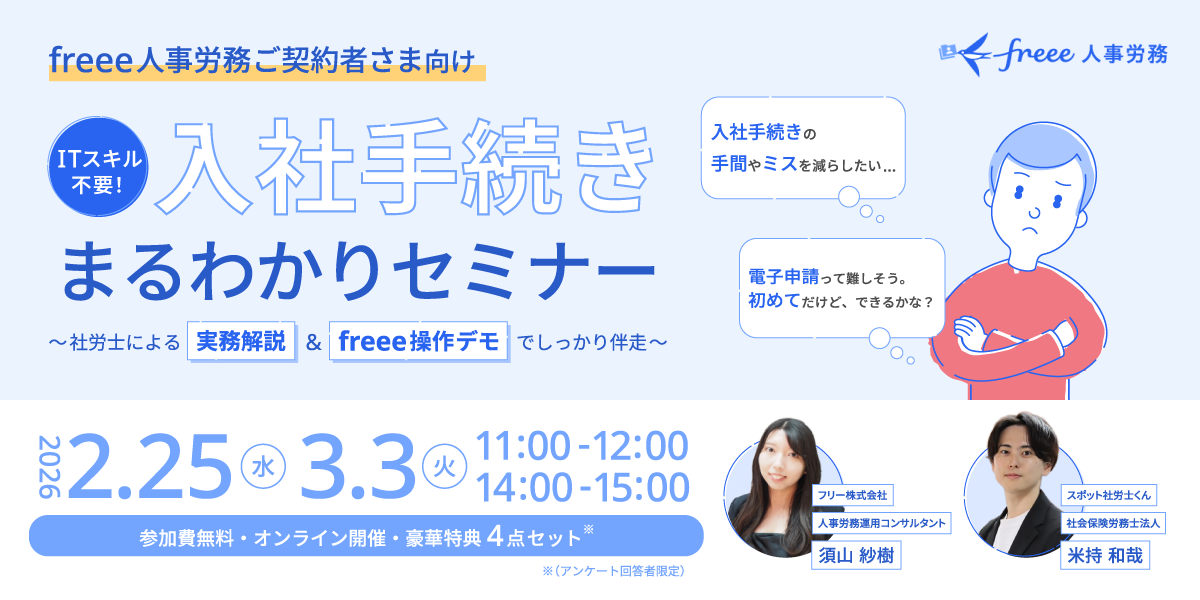セミナーアーカイブ動画 過去に行われたfreee人事労務に関するセミナーのアーカイブ動画を掲載しています。最新のセミナー情報は こちら play_circle_filled ITスキル不要!入社手続きまるわかりセミナー ~社労士による実務解説&freee操作デモでしっかり伴奏~ アーカイブ動画はこちら 実施年月:2026年2月、3月